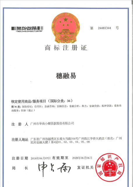 为满足公司品牌战略及市场发展的需求,我司在2017年上半年推出“穗融易”(税融易)业务产品,同时向国家商标总局提出申请“穗融易”商标注册,经过近一年多的受理、初审、公审等一系列的法定程序。近日, “穗融易”注册商标,顺利通过国家工商行政管理总局商标局的审定,商标注册号为24481344&24473588,类别36。