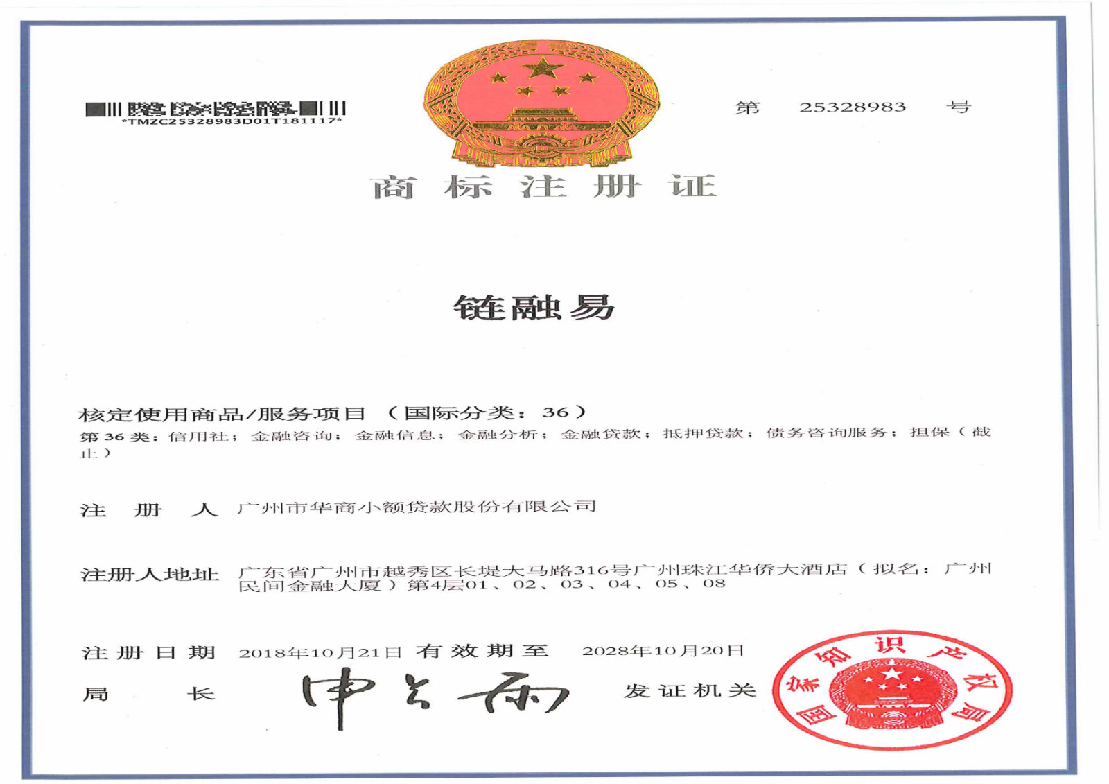 经过近一年多的努力,近日,从国家工商行政管理总局传来喜讯,我司新提交的商标“信融易”、“链融易”被商标局批准注册成功通过。这新添的两个商标核定为第36类,使我司在行业内将具备更强大的品牌竞争优势,区分市场上无品牌无服务的产品,让客户对我司产品服务有个更深的品牌认同,提升我司产品服务的核心竞争力和行业地位。