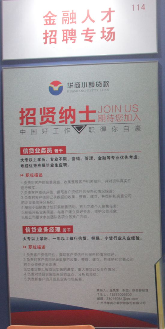 广州市华商小额贷款股份有限公司作为金融街16家参展企业之一,第二次参展金交会,独具特色,大放异彩,吸引众多金融从业人员及相关行业嘉宾参观、咨询。华商小贷在民间金融拓荒的道路上,产品、服务、理念上不断完善提升,创造出一个个新的制高点。同时,华商小贷依托广州民间金融街 “全国民间金融产业知名品牌示范区”的资格,获得了内涵式纵深发展的良好机遇和平台。未来,华商小贷将会着力形成品牌管理体制健全、服务标准体系完善、产业持续健康发展的局面,真正融入及推进我国民间金融创新发展事业中。