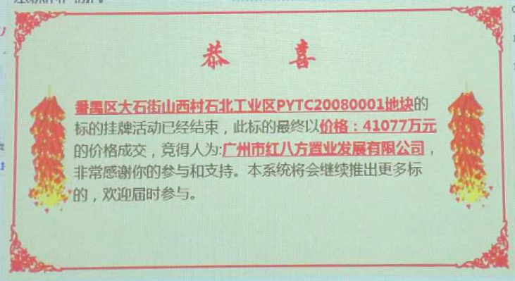 2月17日上午,广州迎来春节后首拍。将近4年无地出让的番禺大石也迎来土地拍卖。广州红八方置业发展有限公司旗开得胜,以底价4.1亿元拍得位于山西村石北工业区PYTC20080001地块,楼面价9080元/平。挂牌公告显示,番禺区大石街地块定位为商业用地兼容商务用地,占地面积34942平方米。本次红八方所竞得地块在番禺区西北部,是番禺最成熟的居住中心之一。
