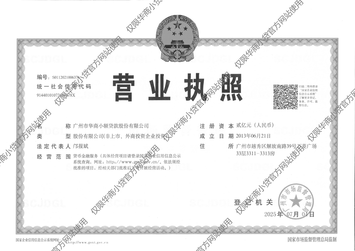 广州市华商小额贷款股份有限公司于2013年5月在广州民间金融街发起设立,实缴注册资本2亿人民币,公司地址位于广州市越秀区解放南路39号万菱广场3311-3313室。